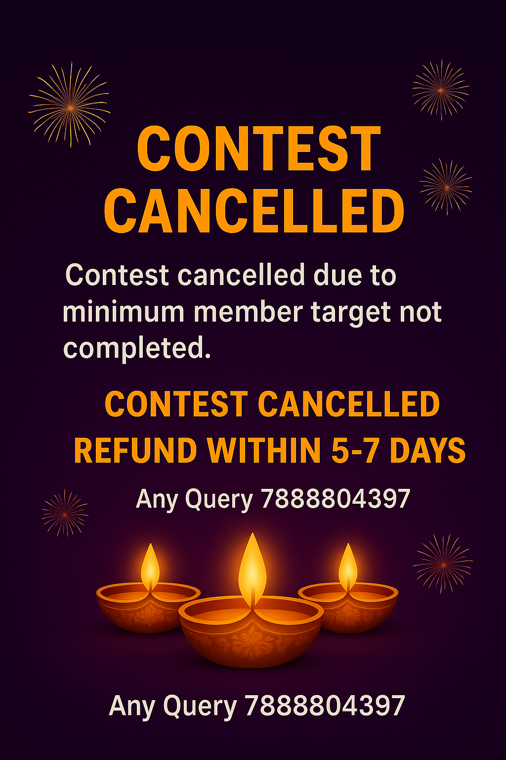 Contest cancelledΒ all payments refund with in 5 to 7 working days